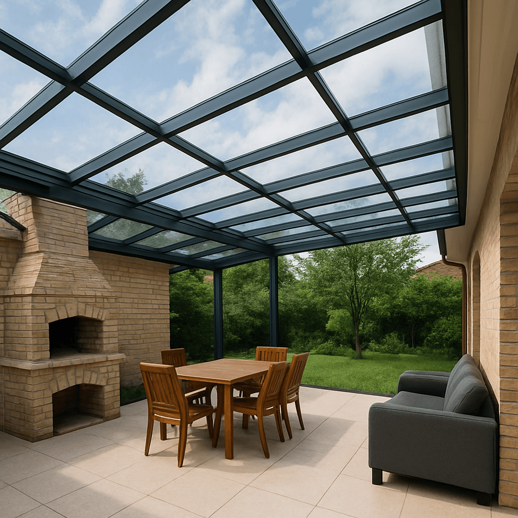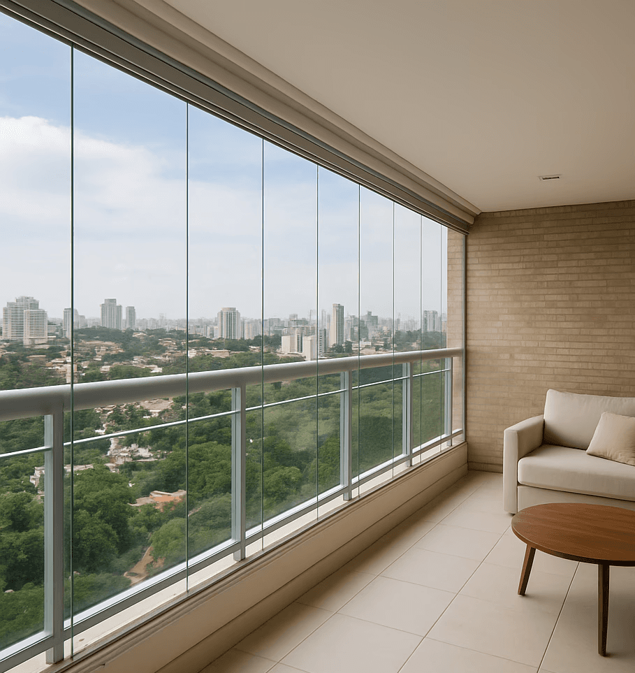 Vidros retráteis ou fixos para proteção contra vento e chuva, com visual moderno e eficiente.