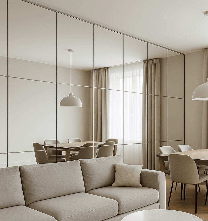 Espelhos recortados conforme o projeto, ideais para banheiros, salas, quartos e academias.